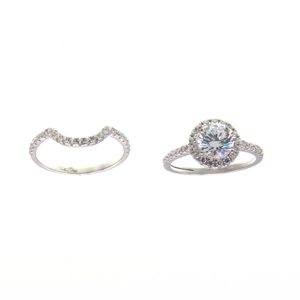 AllianceSolitaire duo accompagne serti grain avec entourage rond est en Or 750 / 1000 (18K) . Ce bijoux est orné de d’oxydes de zirconium. Cette AllianceSolitaire duo accompagne serti grain avec entourage rond pèse 4,16g. Elle est en Or 750 / 1000 (18K) Blanc Ref: MS/317/084179W/SS