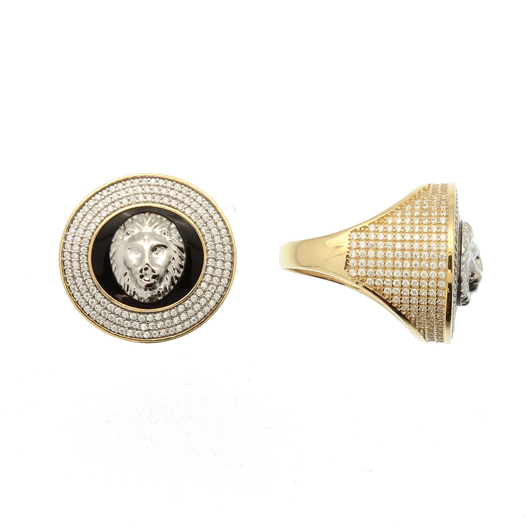 Chevalière tête de lion ronde avec onyx synthétique et pavage d’oxyde sur la table et les cotés est en Or 750 / 1000 (18K) . Ce bijoux est orné de d’oxydes de zirconium. Cette Chevalière tête de lion ronde avec onyx synthétique et pavage d’oxyde sur la table et les cotés pèse 12,1g. Elle est en Or 750 / 1000 (18K) Jaune Ref: MS/316/083744/SS