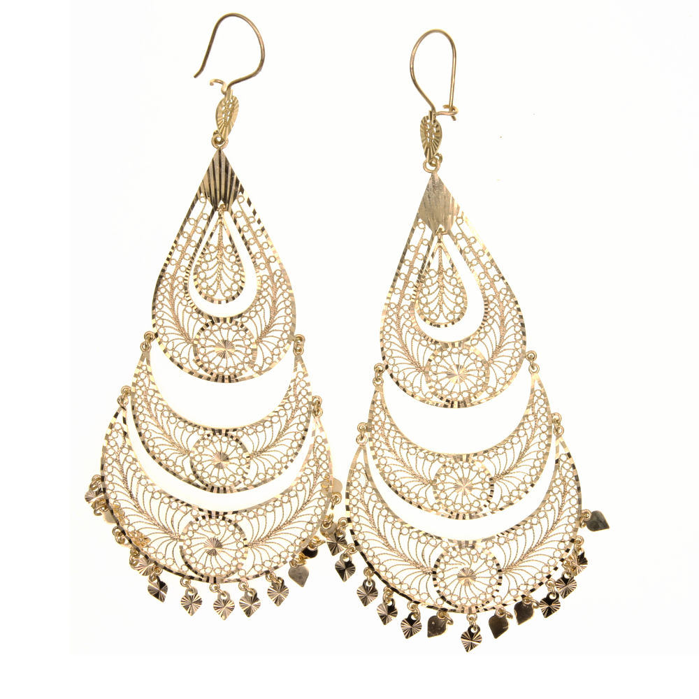 Paire de boucles pendantes 4 étages filigrane est en Or 750 / 1000 (18K) . Ce bijoux ne comporte pas de pierres. Cette Paire de boucles pendantes 4 étages filigrane pèse 21,4g. Elle est en Or 750 / 1000 (18K) Jaune Ref: MS/367/T4109/SS