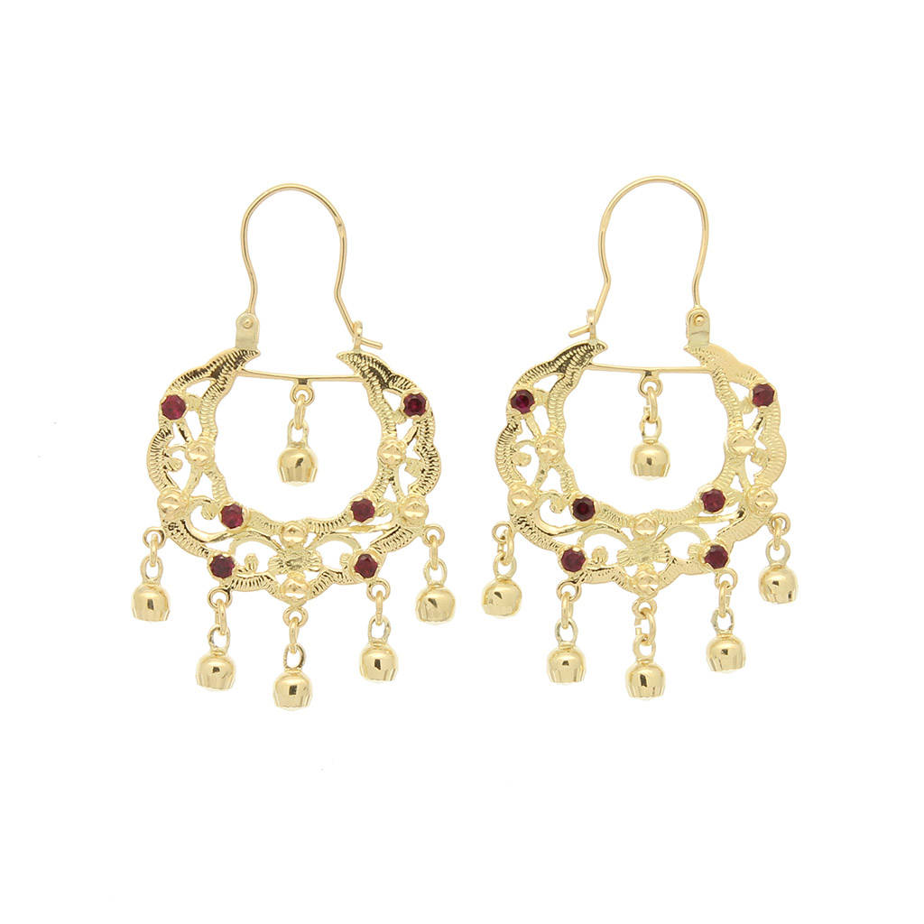 Paire de créoles savoyades découpées et pierres rouges est en Or 750 / 1000 (18K) . Ce bijoux est orné de d’oxydes de zirconium. Cette Paire de créoles savoyades découpées et pierres rouges pèse 11.4g. Elle est en Or 750 / 1000 (18K) Jaune Ref: MS/361/13677/SS