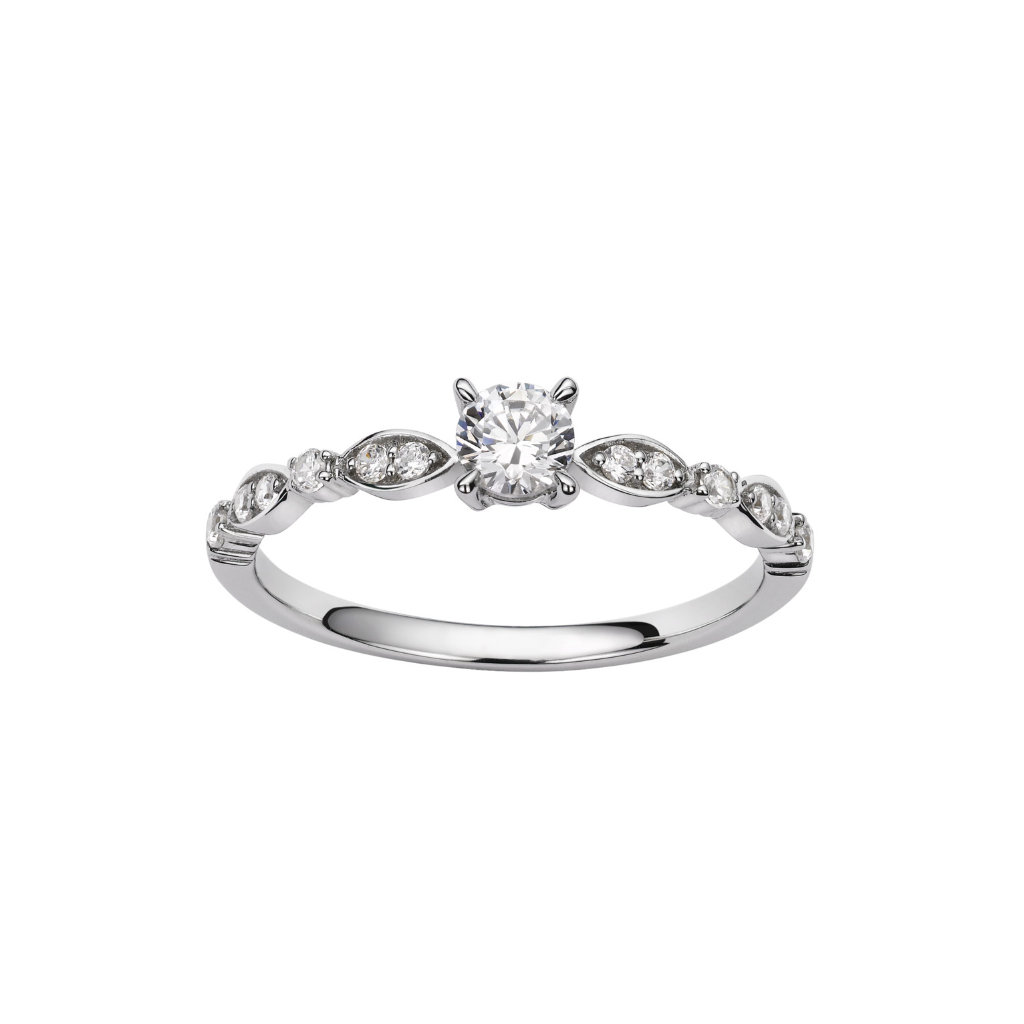 Solitaire 4 griffes avec accompagnement fantaisie est en Or 750 / 1000 (18K) . Ce bijoux est orné de de diamants. Cette Solitaire pèse 1,53g. Elle est en Or 750 / 1000 (18K) Blanc Cet article est personnalisable à l’aide d’une gravure intérieure et / ou extérieur.
